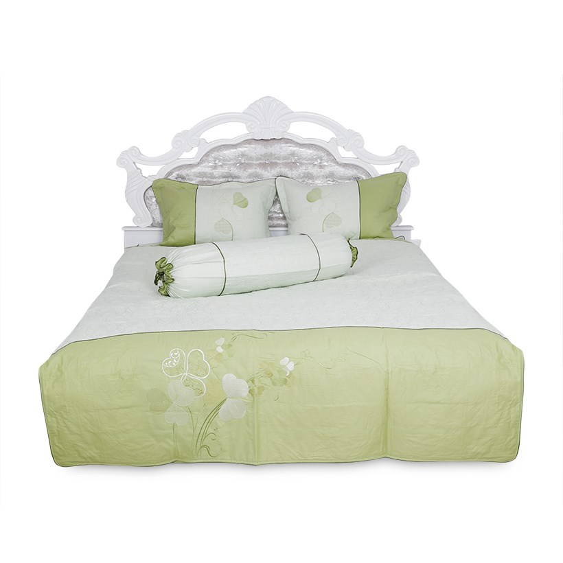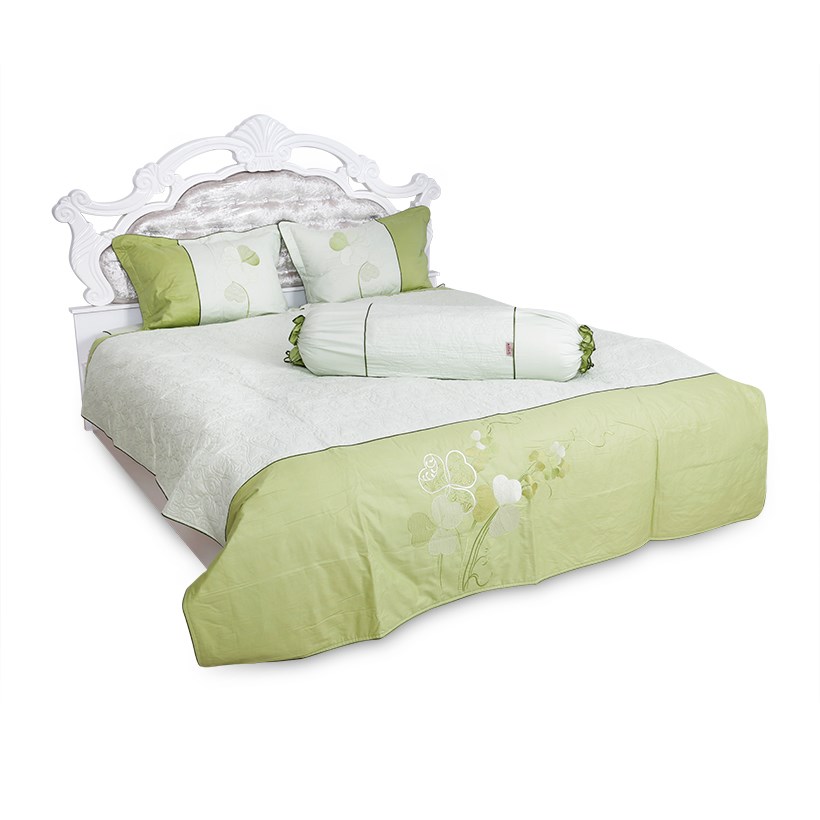 - Bộ chăn drap gối sử dụng tông màu xanh lá non chủ đạo, thể hiện được nét nhẹ nhàng, trang nhã trong thiết kế. Họa tiết thêu tỉ mỉ đến từng đường kim mũi chỉ. Những đường chần hoa văn tinh tế, chắc chắn, vừa có tính thẩm mỹ cao vừa chống nhăn cho sản phẩm sau khi giặt.